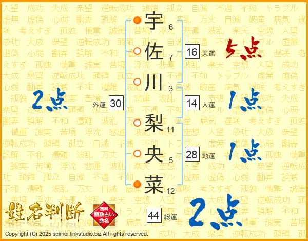宇(6画)佐(7画)川(3画) 梨(11画)央(5画)菜(12画)