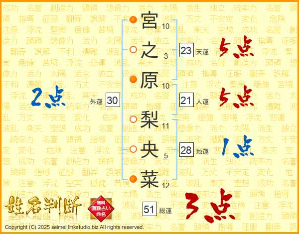 宮(10画)之(3画)原(10画) 梨(11画)央(5画)菜(12画)