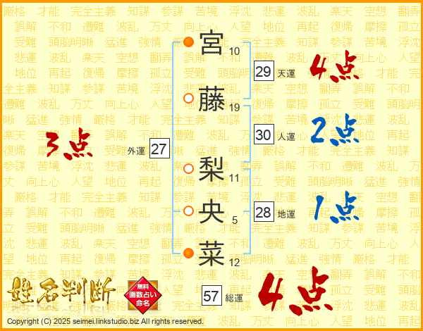 宮(10画)藤(19画) 梨(11画)央(5画)菜(12画)
