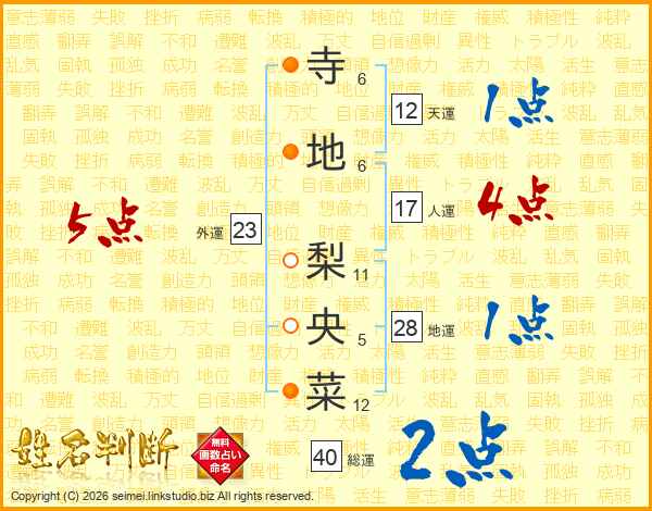 寺(6画)地(6画) 梨(11画)央(5画)菜(12画)