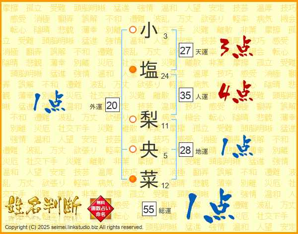 小(3画)塩(24画) 梨(11画)央(5画)菜(12画)