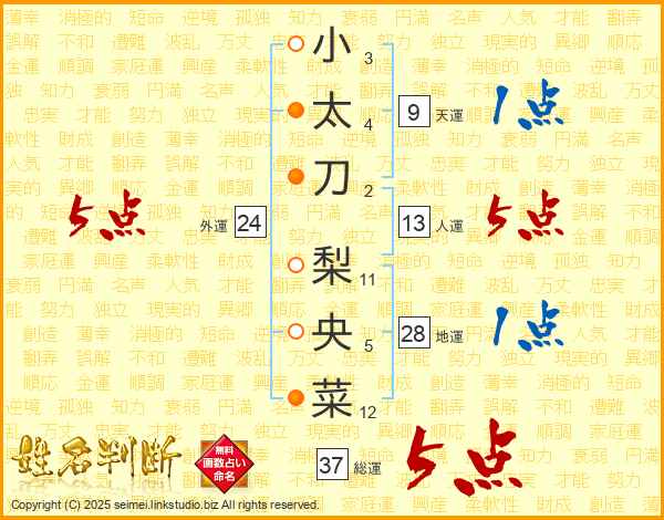 小太刀梨央菜さんの総運は37画の5点!
