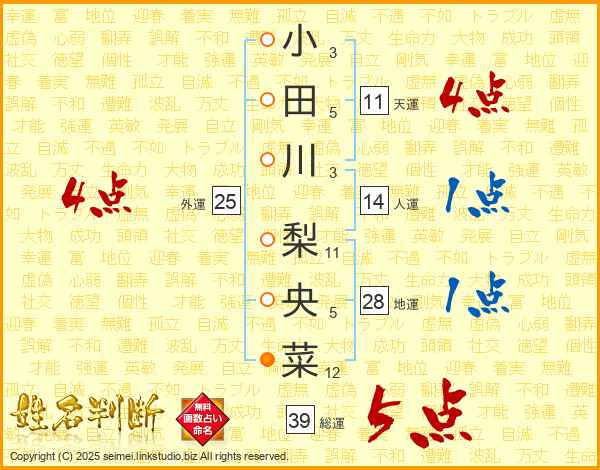 小(3画)田(5画)川(3画) 梨(11画)央(5画)菜(12画)
