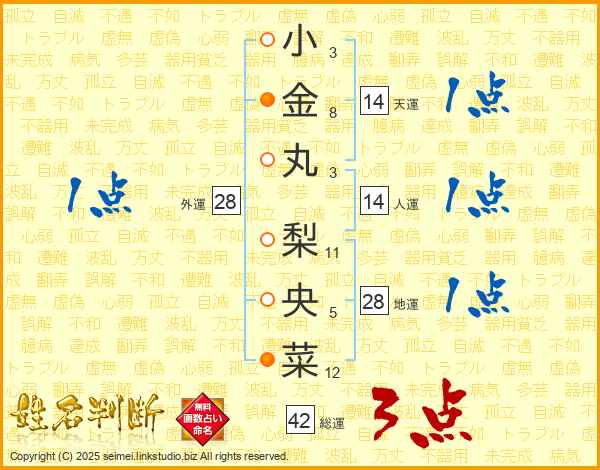 小(3画)金(8画)丸(3画) 梨(11画)央(5画)菜(12画)