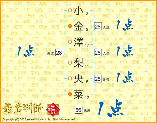 小(3画)金(8画)澤(17画) 梨(11画)央(5画)菜(12画)