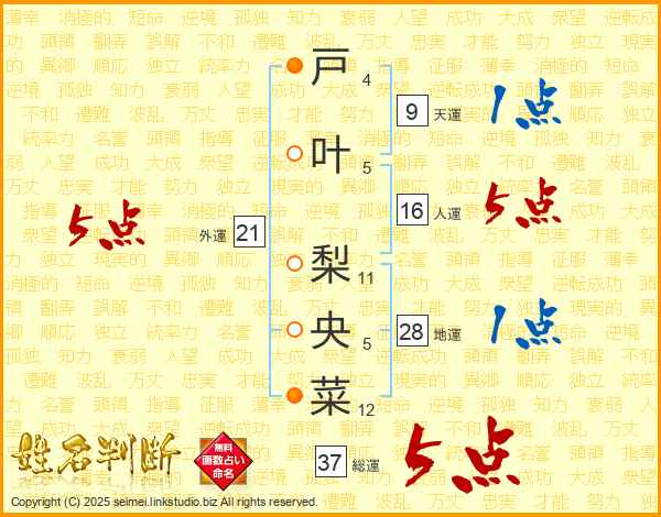 戸(4画)叶(5画) 梨(11画)央(5画)菜(12画)