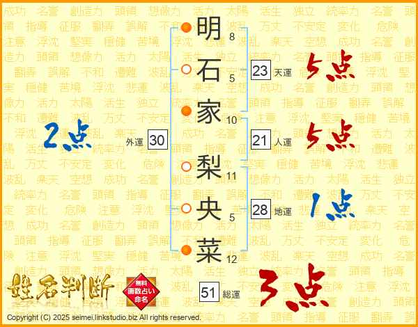 明(8画)石(5画)家(10画) 梨(11画)央(5画)菜(12画)