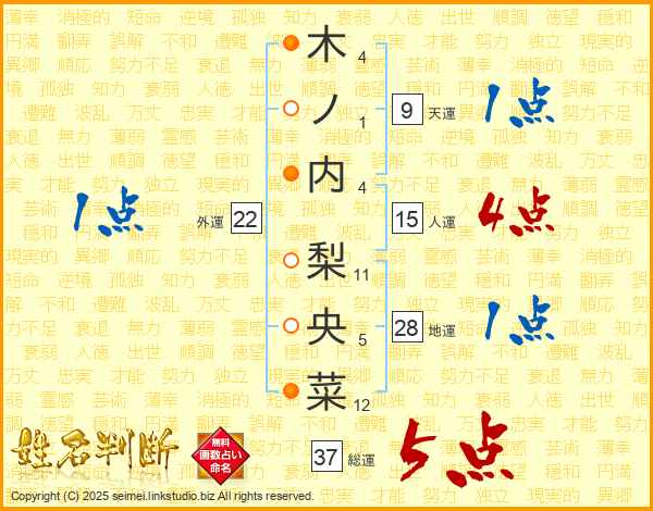 木ノ内梨央菜さんの総運は37画の5点!