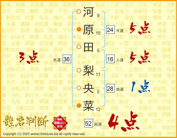 河(9画)原(10画)田(5画) 梨(11画)央(5画)菜(12画)