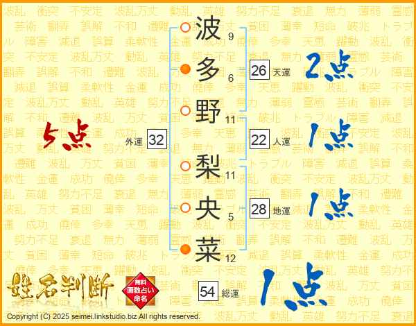 波(9画)多(6画)野(11画) 梨(11画)央(5画)菜(12画)