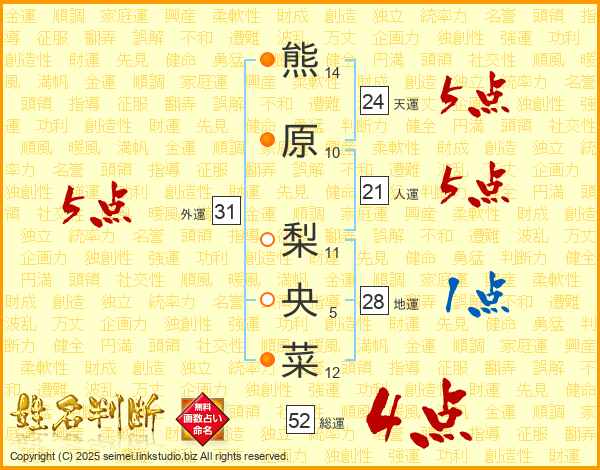 熊(14画)原(10画) 梨(11画)央(5画)菜(12画)
