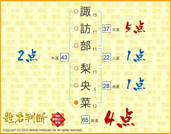 諏(15画)訪(11画)部(11画) 梨(11画)央(5画)菜(12画)