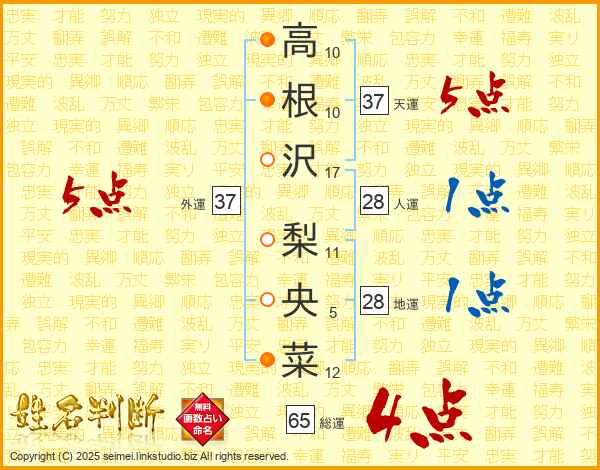 高(10画)根(10画)沢(17画) 梨(11画)央(5画)菜(12画)