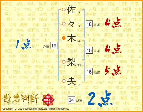 佐(7画)々(7画)木(4画) 梨(11画)央(5画)