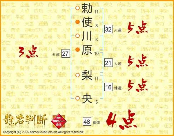 勅(11画)使(8画)川(3画)原(10画) 梨(11画)央(5画)