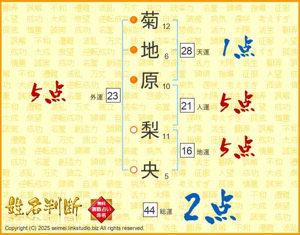 菊(12画)地(6画)原(10画) 梨(11画)央(5画)