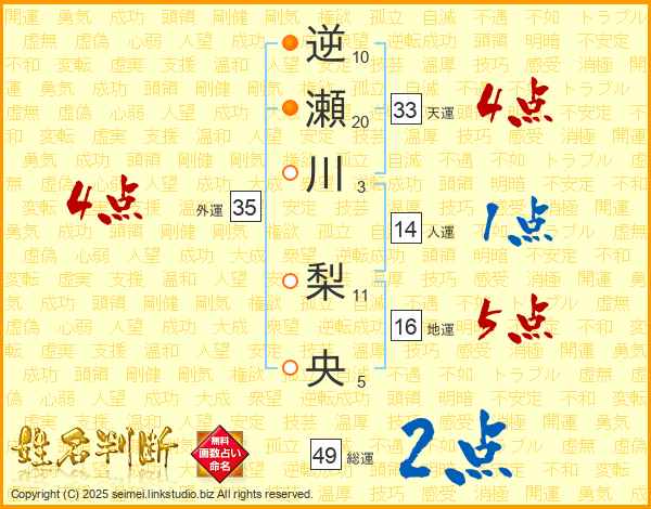 逆(10画)瀬(20画)川(3画) 梨(11画)央(5画)