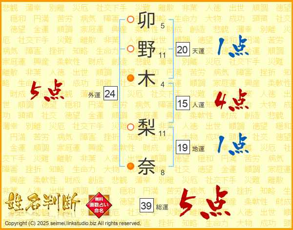 卯(5画)野(11画)木(4画) 梨(11画)奈(8画)