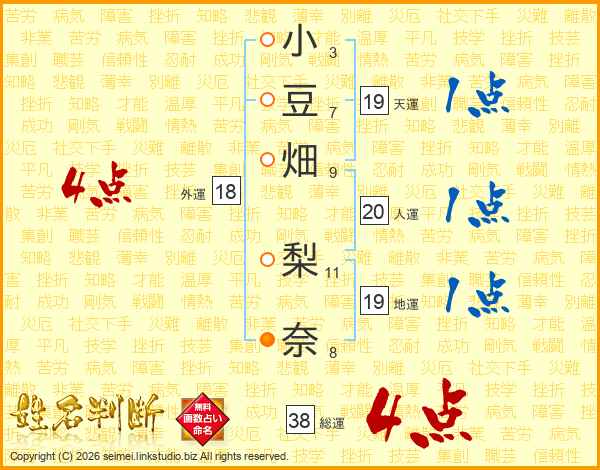 小(3画)豆(7画)畑(9画) 梨(11画)奈(8画)
