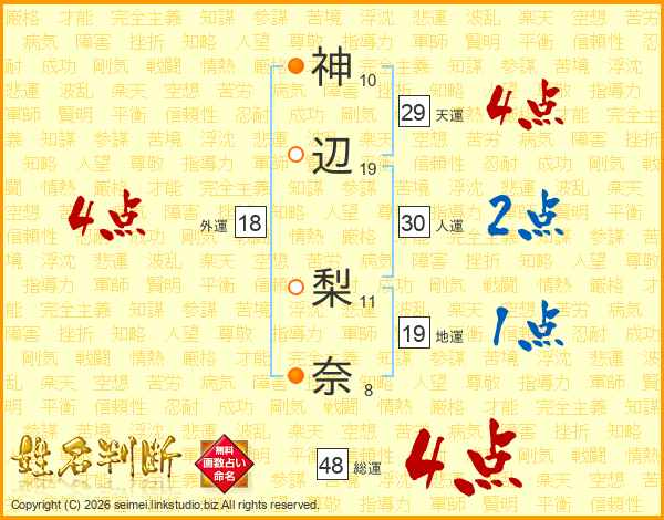 神(10画)辺(19画) 梨(11画)奈(8画)