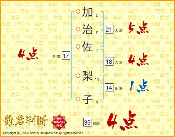加(5画)治(9画)佐(7画) 梨(11画)子(3画)