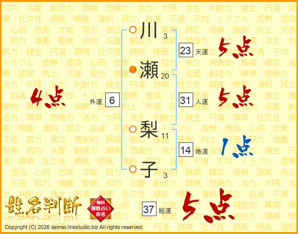 川(3画)瀬(20画) 梨(11画)子(3画)