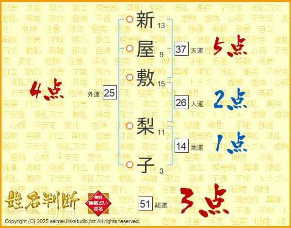 新(13画)屋(9画)敷(15画) 梨(11画)子(3画)