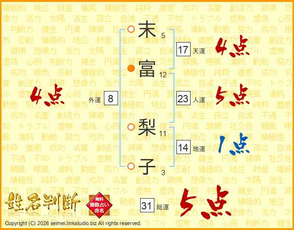 生活面を象徴する運勢です。外部から受ける影響力を表し、結婚運、家庭運や職場、環境への順応性を表します。総運から人運を引いた画数。姓や名が1文字の場合を除く。