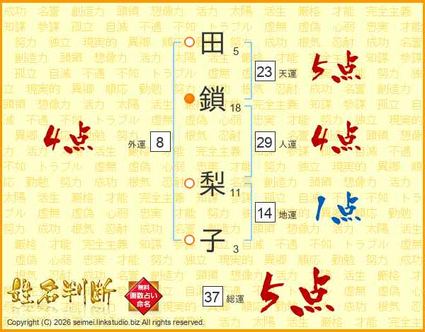 田(5画)鎖(18画) 梨(11画)子(3画)