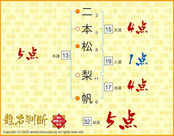 生活面を象徴する運勢です。外部から受ける影響力を表し、結婚運、家庭運や職場、環境への順応性を表します。総運から人運を引いた画数。姓や名が1文字の場合を除く。