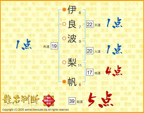 伊(6画)良(7画)波(9画) 梨(11画)帆(6画)