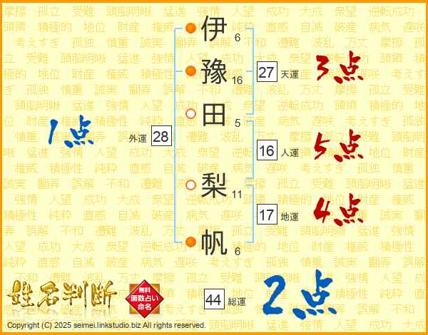 伊(6画)豫(16画)田(5画) 梨(11画)帆(6画)