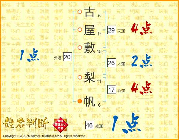古(5画)屋(9画)敷(15画) 梨(11画)帆(6画)