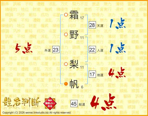 霜(17画)野(11画) 梨(11画)帆(6画)
