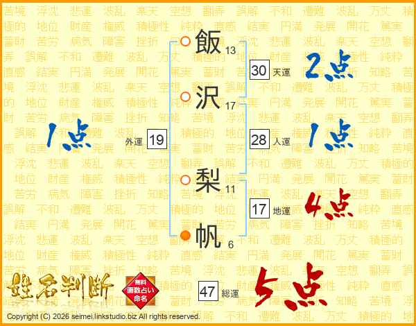 飯(13画)沢(17画) 梨(11画)帆(6画)