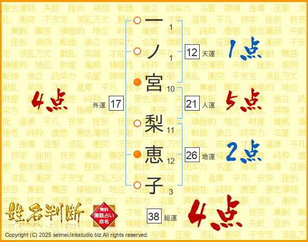 一ノ宮梨恵子さんの総運は38画の4点!