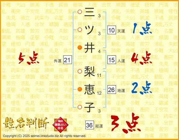 三(3画)ツ(3画)井(4画) 梨(11画)恵(12画)子(3画)