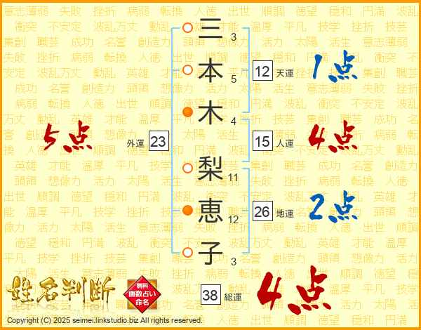 三(3画)本(5画)木(4画) 梨(11画)恵(12画)子(3画)