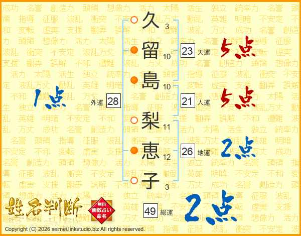 久(3画)留(10画)島(10画) 梨(11画)恵(12画)子(3画)