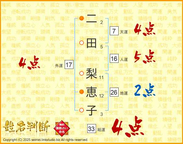 二(2画)田(5画) 梨(11画)恵(12画)子(3画)