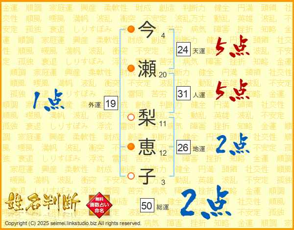 今(4画)瀬(20画) 梨(11画)恵(12画)子(3画)