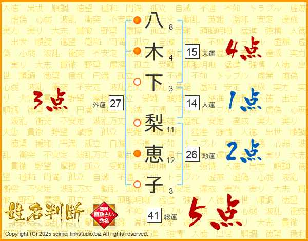 八(8画)木(4画)下(3画) 梨(11画)恵(12画)子(3画)
