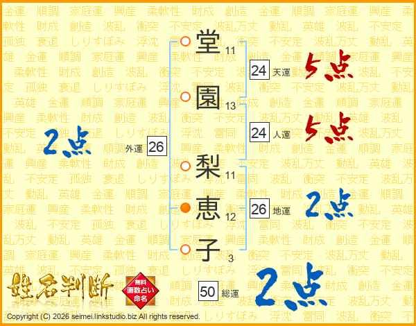 堂(11画)園(13画) 梨(11画)恵(12画)子(3画)