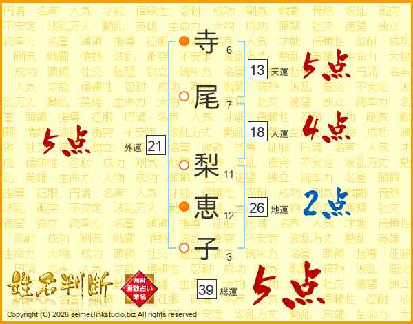 寺(6画)尾(7画) 梨(11画)恵(12画)子(3画)
