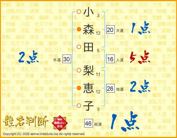 小(3画)森(12画)田(5画) 梨(11画)恵(12画)子(3画)