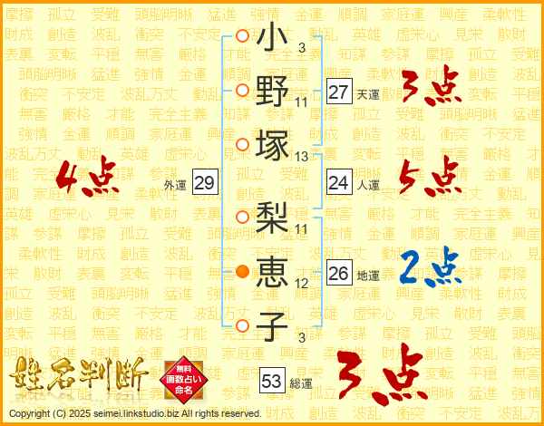 小(3画)野(11画)塚(13画) 梨(11画)恵(12画)子(3画)
