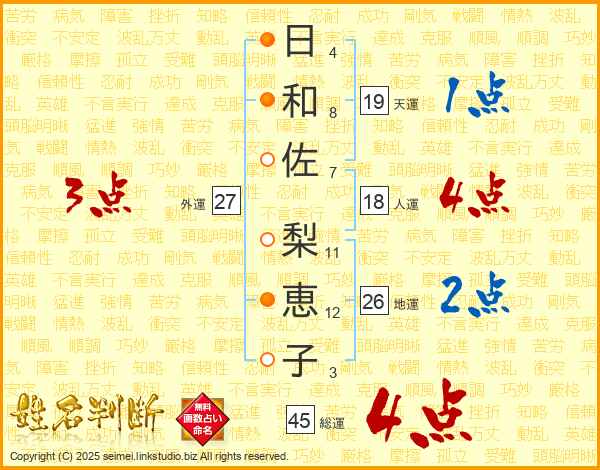 日(4画)和(8画)佐(7画) 梨(11画)恵(12画)子(3画)