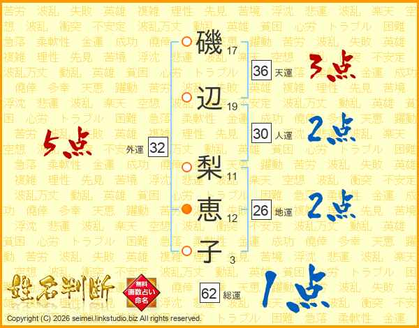 磯(17画)辺(19画) 梨(11画)恵(12画)子(3画)