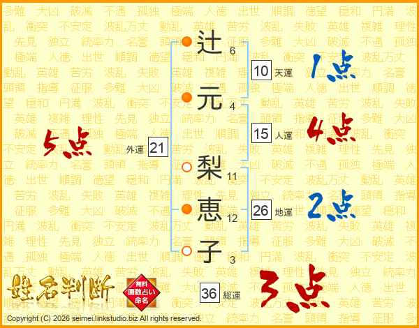 辻(6画)元(4画) 梨(11画)恵(12画)子(3画)