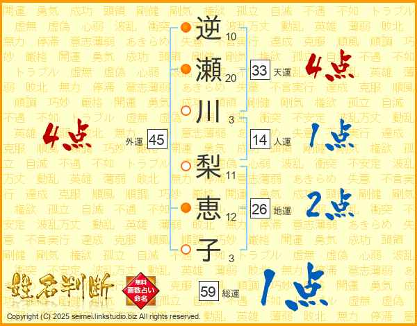 逆(10画)瀬(20画)川(3画) 梨(11画)恵(12画)子(3画)